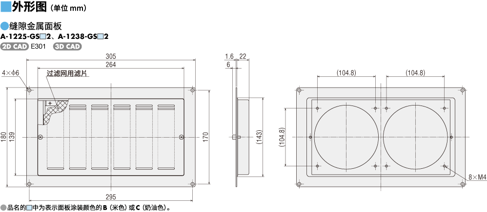 说明 | 可安装2台轴流风扇。 面板(1片 颜色:米色)、铁制防护网(2片)、风扇安装用螺丝、面板安装用螺丝的套件品。 |