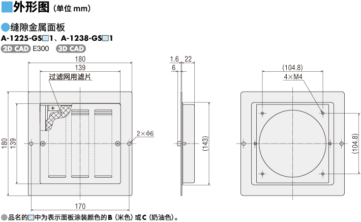 说明 | 可安装1台轴流风扇。 面板(1片 颜色:米色)、铁制防护网(1片)、风扇安装用螺丝、面板安装用螺丝的套件品。 |