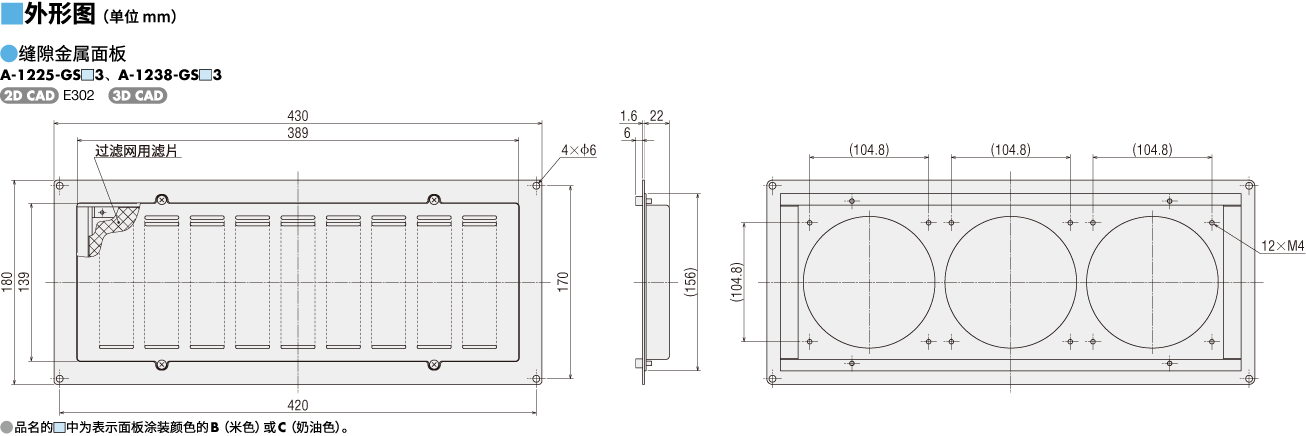 说明 | 可安装3台轴流风扇。面板(1片 颜色:米色)、铁制防护网(3片)、风扇安装用螺丝、面板安装用螺丝的套件品。 |