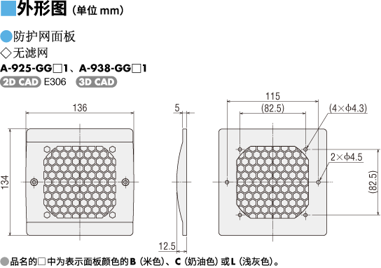 说明 | 面板(1片 颜色:浅灰)、铁制防护网(1片)、风扇安装用螺丝、面板安装用螺丝的套件品。 |