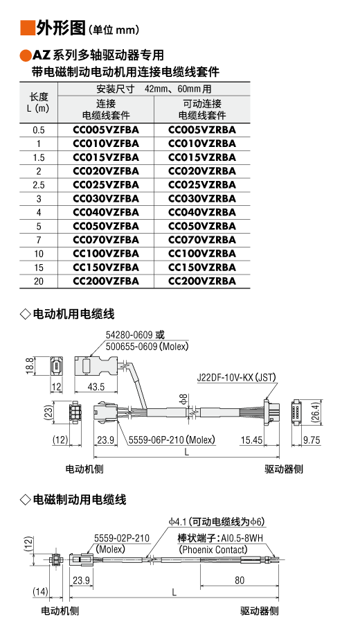说明 | 安装尺寸42 mm、60 mm的电动机(带电磁制动)与驱动器间连接时必需的电动机用、电磁制动用电缆线套件。长度1 m |