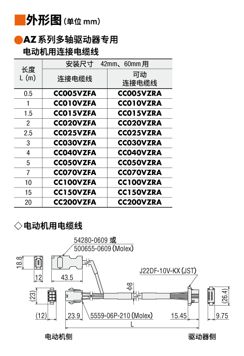 说明 | 请于安装尺寸42 mm、60 mm的电动机(带电磁制动除外)与驱动器间连接时使用。长度3 m |