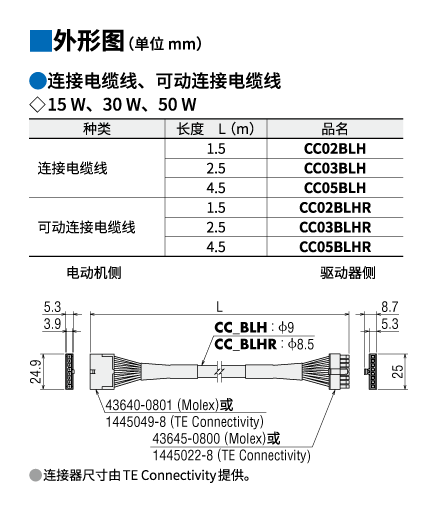 说明 | 电动机与驱动器间的延长用电缆线(2.5 m)。最长延长距离为5m。 |