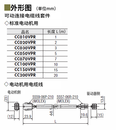 说明 | 电动机与驱动器间连接,或电动机与电缆线间中继时必需的可动电动机用电缆线。请于电动机安装在可动部,电缆线需弯曲时使用。长度5 m |