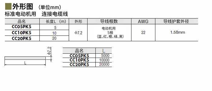 说明 电动机与驱动器间的延长用连接电缆线。无端末处理、5芯(蓝、红、橙、绿、黒)、长5 m