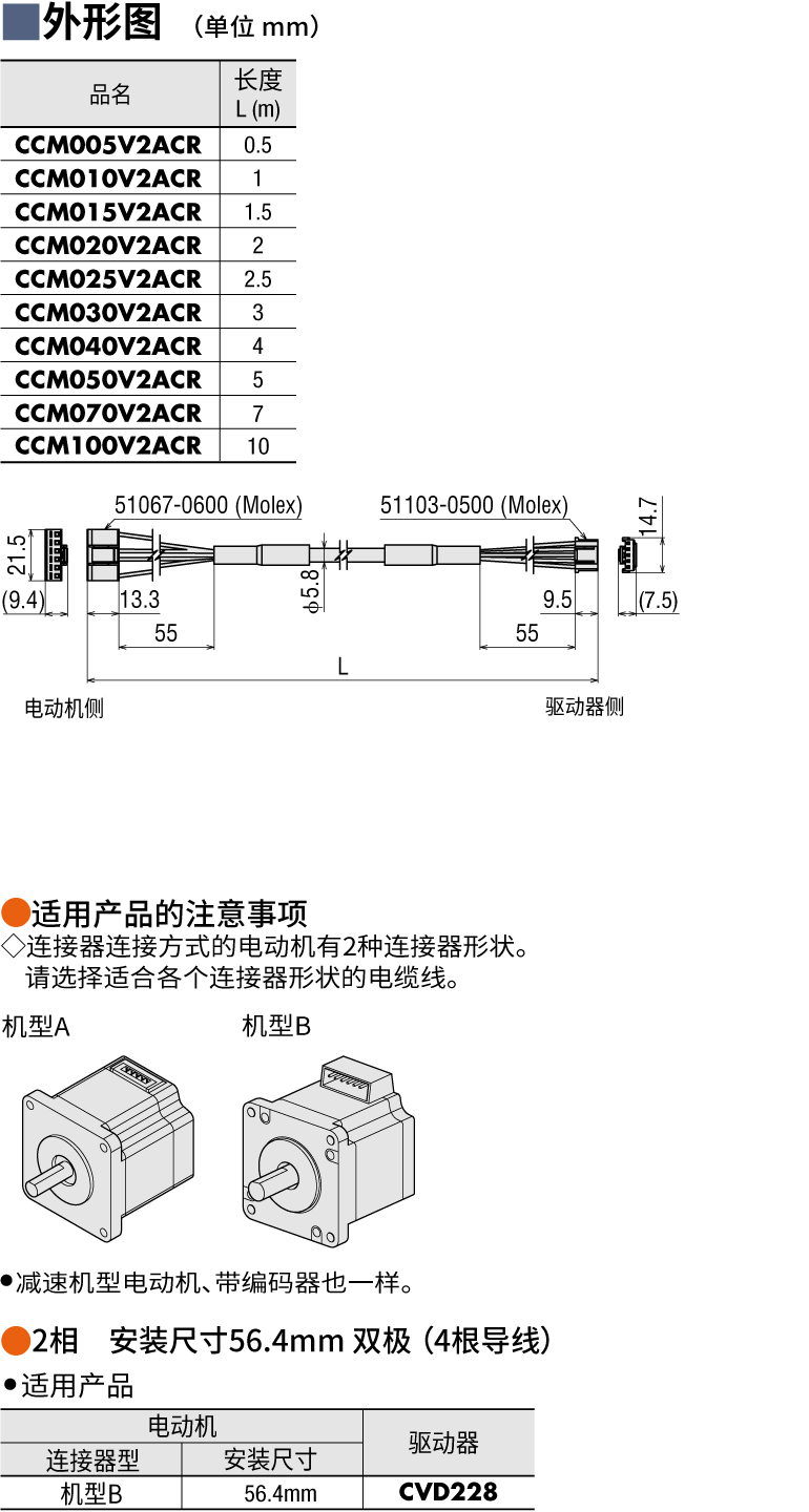 说明 | 连接器连接方式电动机与驱动器直接连接用的可动电缆线。请于电动机安装在可动部,电缆线需弯曲时使用。两端带连接器,长1 m |