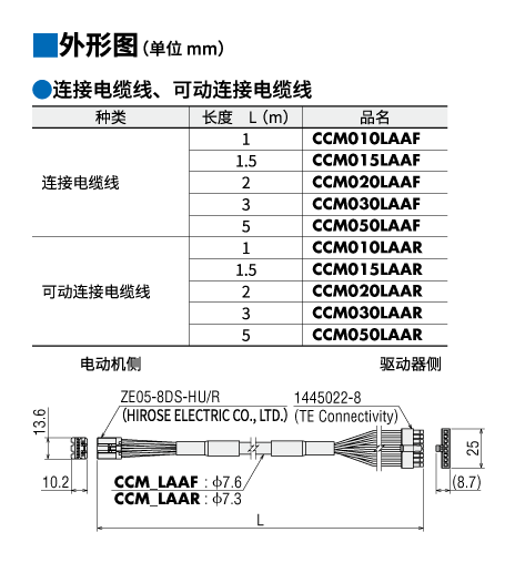 说明 | 连接器型电动机与驱动器直接连接用的可动电缆线。两端带连接器,长3 m |