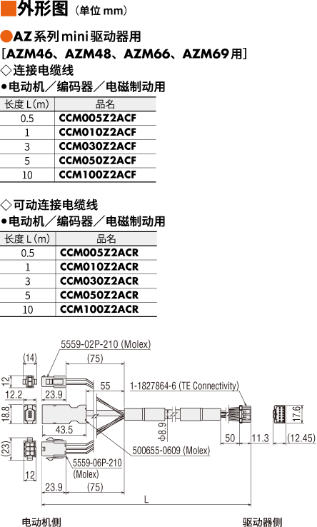 说明 | 请于安装尺寸42 mm、60 mm的电动机(带电磁制动)与驱动器间连接时使用。长度10 m |