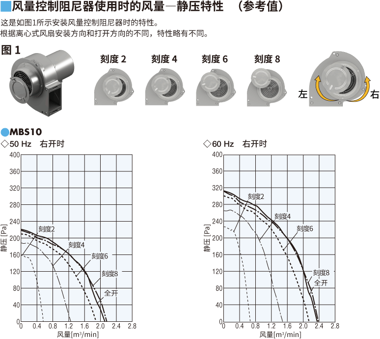 说明 | 安装在离心式风扇吸风口,安装后可以很容易在手边调节风量的周边机器。 阻尼器上刻有刻度数字。( MBS10用) |