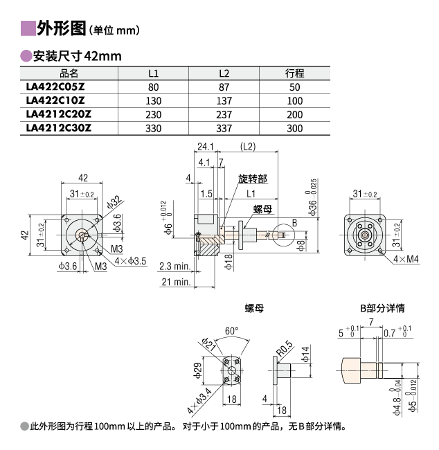 - 丝杠带适配器: 树脂螺母、电动机输出轴安装螺丝、电动机组装螺丝、润滑油、使用说明书