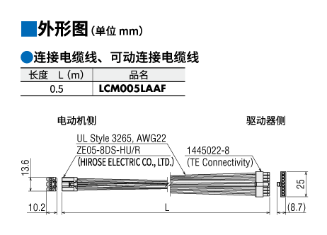 说明 连接器型电动机与驱动器直接连接用的电缆线。两端带连接器,长0.5 m