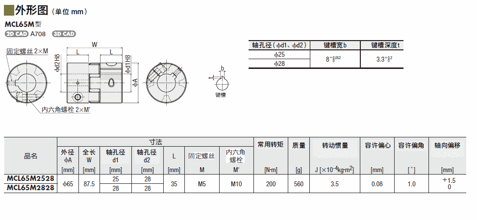 说明 外径:65 mm、长度:87.5 mm、轴孔径d1:28 mm、轴孔径d2:28 mm